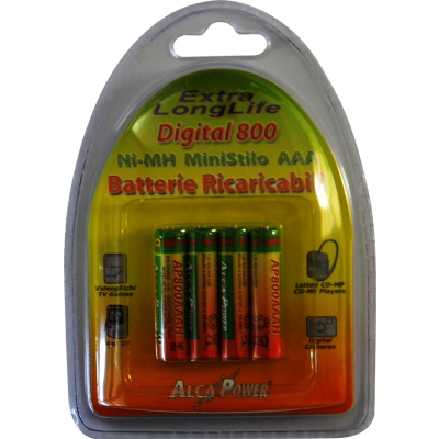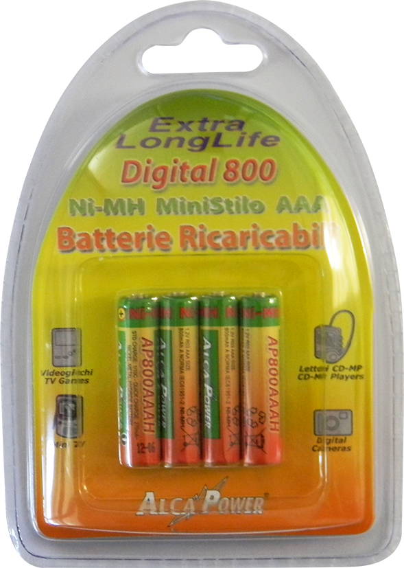 Blister di 4 NI-MH AAA 1.2V Digital 800 Blister 4 batterie Digital 800 NI-MH formato ministilo in un'accattivante e ben curata confezione consumer - Capacità 800 mAh a norma IEC61951-2 Codice EAN: 8055323210393 |