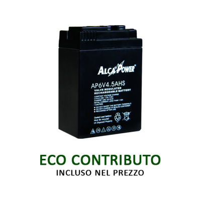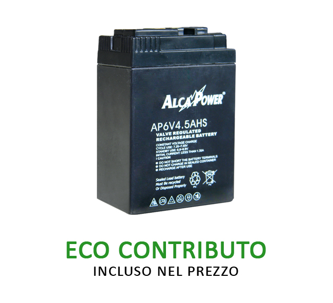 Ricaric. Ermetica 6V 4,5 Ah-Terminali per Lampade Batteria al piombo ricaricabile ermetica 6V 4,5Ah Adatta come ricambio per la lampada SF829 Larghezza: 70,00 mm Altezza: 100,00 mm Profondità: 46,00 mm Codice EAN: 8055323213202 |