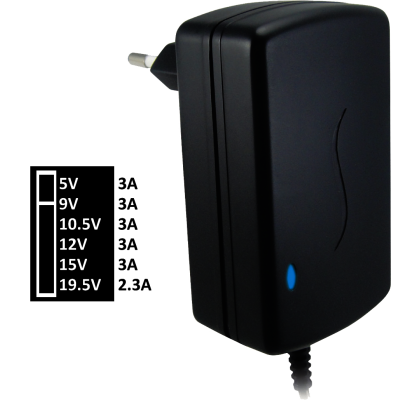 Adattatore 5-9-10.5-12-15V 3A - 19.5V 2.3A / 45W Alimentatore Multitensione per UltraBook, NoteBook e Tablet. - Ingresso: 100 - 240V AC 50/60 Hz - Uscita: 5-9-10.5-12-15V DC 3A; 19.5V 2.3A; 45W - 8 adattatori d’uscita intercambiabili - Uscita stabilizzata, bassa interferenza e Basso ripple - Cavo 220V con spina europa in dotazione. Un solo alimentatore adatto per i più diffusi dispositivi: ACER, ASUS, COMPAQ, TOSHIBA, FUJITSU, HP, Lenovo, Samsung e molti altri. Codice EAN: 8055323216463 |
